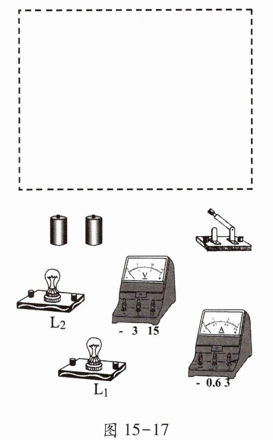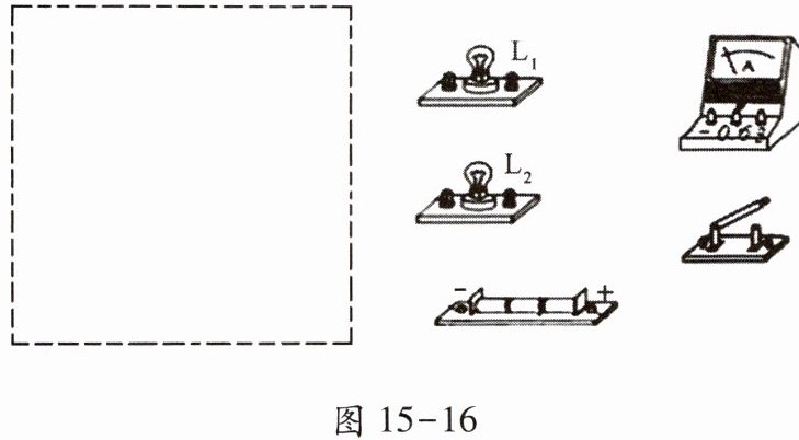 17. 在如图 15 - 16 中的虚线框内画出满足下列要求的电路图:灯$ L_1 $和$ L_2 $并联,开关控制整个电路,电流表测灯$ L_1 $电流. 请按照电路图连接右侧的实物图.
