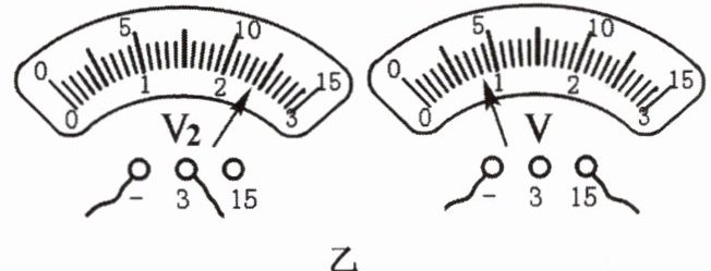 (1) 乙图是小芳进行实验时电压表 V₂ 和 V 的示数,请把测量数据填在小芳的实验数据记录表中.