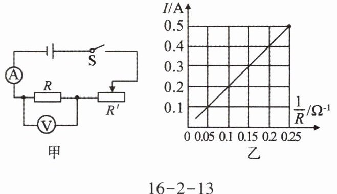 5. 小明利用如图 16 - 2 - 13 甲所示的电路探究通过导体的电流与电阻的关系,图乙是根据实验的数据绘出了 $ I - \frac{1}{R} $ 图像,由图可知(
