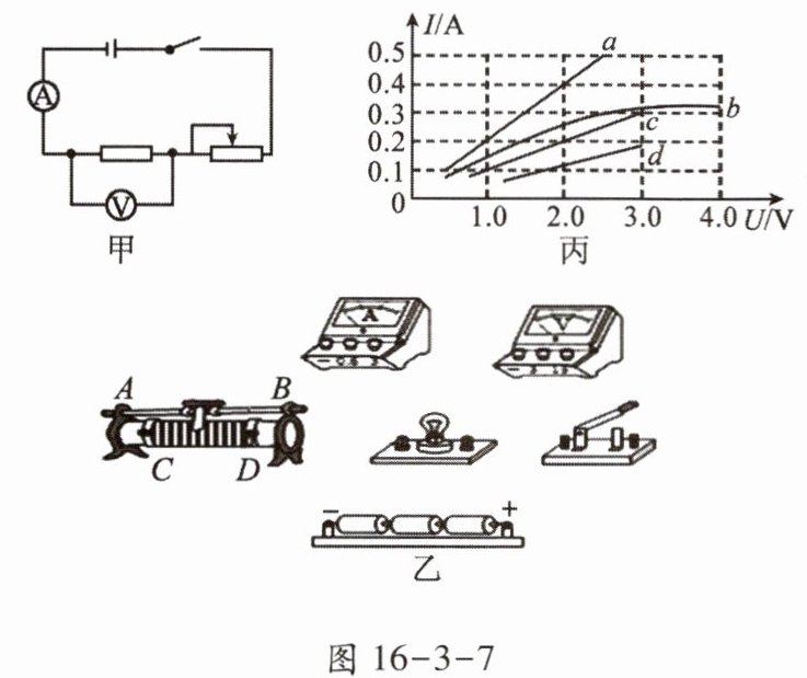 (3) 小明根据实验数据分别作出了$a$、$b$、$c$、$d四条I-U$图线,如图丙所示.