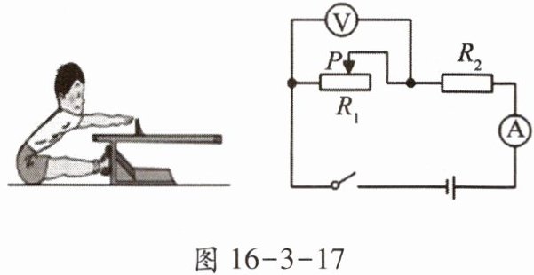 9. 如图 16-3-17 是某物理兴趣小组,设计的简易坐位体前屈测试仪的测试示意图、简化原理图。在测试中,测试的同学向前推动测试仪的滑块实际上是移动滑动变阻器的滑片,电压表的示数用来反映被测试者的成绩。电源电压恒为$12V$,电压表量程$0\sim3V$,电流表量程$0\sim0.6A$,滑动变阻器$R_{1}$标有“$15\Omega$ $1A$”,滑片$P每移动1cm$,$R_{1}的电阻变化0.5\Omega$,定值电阻$R_{2} = 20\Omega$。