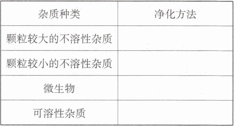 杂质。3. 了解自来水的生产过程,结合净化天然水的活动经验,归纳常见的水的净化方法。