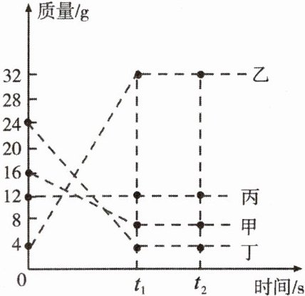 2. 在一密闭容器中加入甲、乙、丙、丁四种物质,在一定条件下发生化学反应,测得反应前及 $t_{1}$、$t_{2}$ 时各物质的质量如图所示。下列说法中,不正确的是(