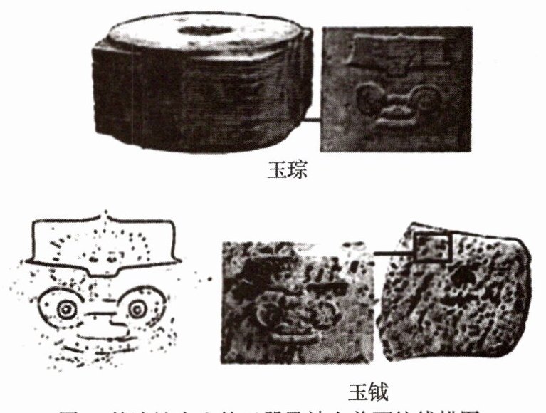 图 3 某遗址出土的玉器及神人兽面纹线描图
