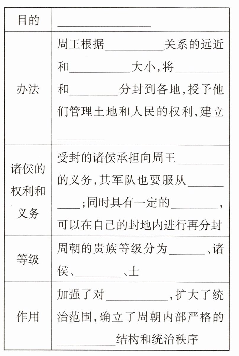 (3)稳定周初的政治形势,巩固疆土;血缘;功劳;宗亲;功臣;诸侯国;进献贡物;周王调遣;统治权;天子;卿大夫;地方的控制;等级