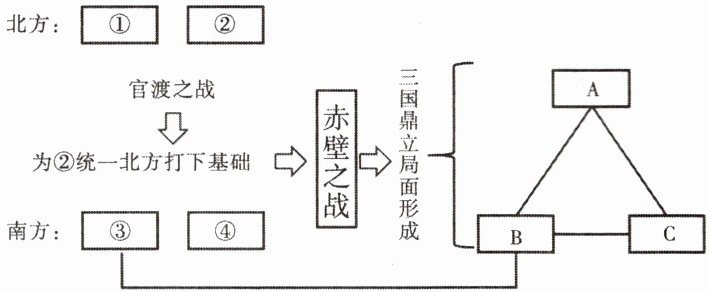 (1)①袁绍;②曹操;③刘备;④孙权;A魏;B蜀;C吴。