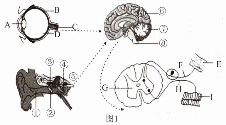 24. 人体对周围世界的感知是靠分布在身体不同部位的感受器获得的,图1是神经系统的部分结构示意图,图2是眼球前后径变化曲线图,请据图回答问题。