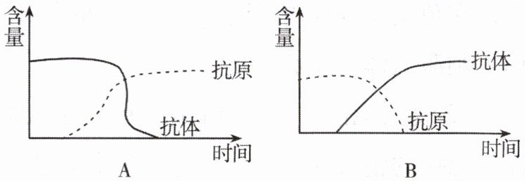 。初次接种体内会产生相应的抗体,如图是患者体内抗原、抗体的含量随时间变化示意图,正确的是(B