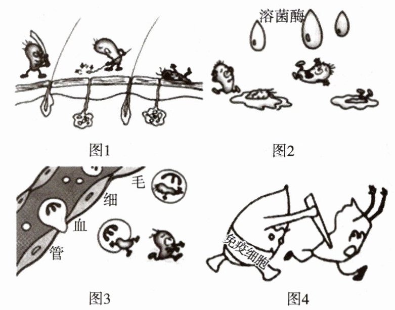 21. 下面四幅漫画的寓意是人体对病原体的防御功能。请分析图片并回答以下问题。