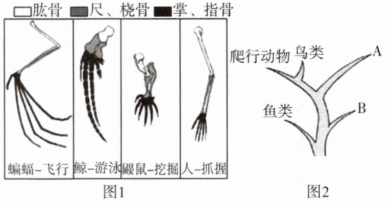 24. 生物从无到有,再到如今种类繁多,经历了漫长的进化过程。下图 1 是四种动物前肢骨骼的对比,图 2 是脊椎动物进化树的示意图,请据图分析回答有关问题。