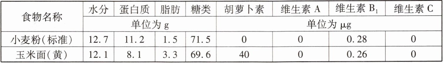 (填“小麦”或“玉米”)食品为主。食物中主要含有六大营养物质,上表中未列出来的是无机盐