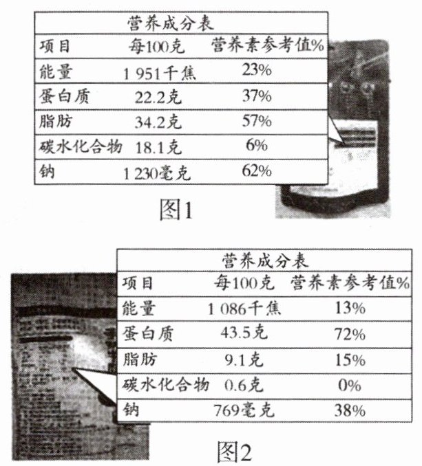 含量,因为它是建造和修复身体的重要原料。(3)营养成分表中的“营养素参考值%”是指这种食物中的某类营养素占健康成年人一天推荐摄入量的百分比。以图1为例,每食用100g该食物,能获取一天中所需蛋白质的37%。若食用200g该食物,所摄入的钠