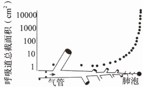 4. 下图表示呼吸道总截面积与呼吸道不同部位之间的关系。一个肺泡的截面积比气管的截面积小得多,但是肺泡的总面积却远远大于气管,这主要是因为 (