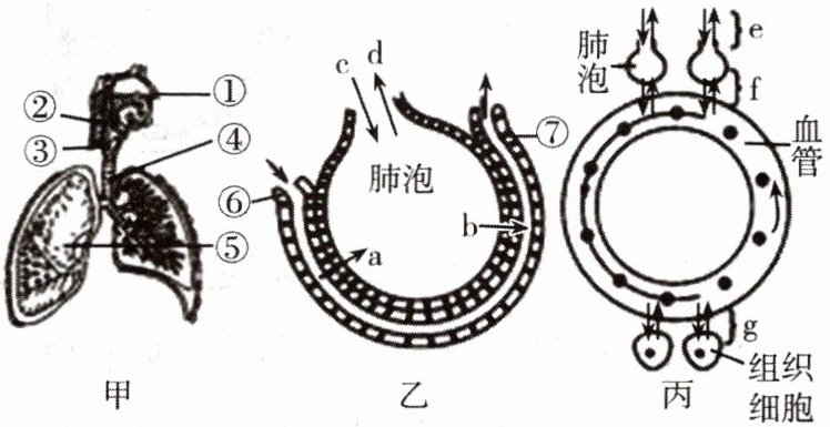 9. 图甲是人体呼吸系统示意图,图乙是肺泡的结构图(a、b、c、d表示相关气体),图丙是人体的气体交换示意图,请根据图回答问题。