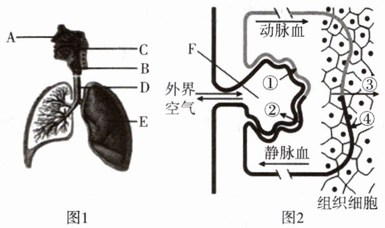 2. (2024年·江苏无锡)如图1为人体呼吸系统组成图,图2为肺内及组织中气体交换示意图,图中字母A~F表示结构或部位,①~④表示血液或细胞中的物质。请据图回答下列问题。