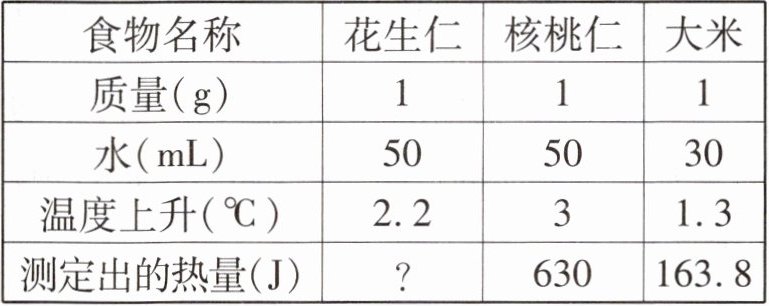 (4)平均值 462 J 花生仁和核桃仁等干果中的能量比大米高 食物燃烧时,会向周围散失热量(或简易装置下,食物燃烧不充分等)