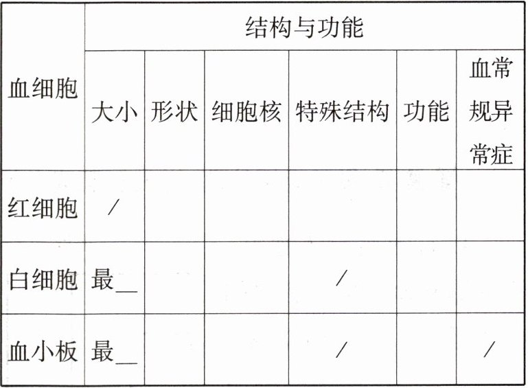 红细胞:双面凹的圆饼状;无细胞核;富含血红蛋白;运输氧气和部分二氧化碳;贫血。白细胞:大;有多种形态;有细胞核;防御和保护;炎症。血小板:小;不规则;无细胞核;止血和加速凝血。
