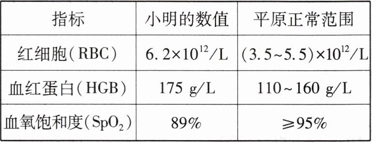 2. 小明是一名登山爱好者,最近刚从海拔 4000 米的青藏高原旅行回来。他在高原期间感到轻微头晕、乏力,但逐渐适应。回到平原后,他进行了血常规检查,结果如下: