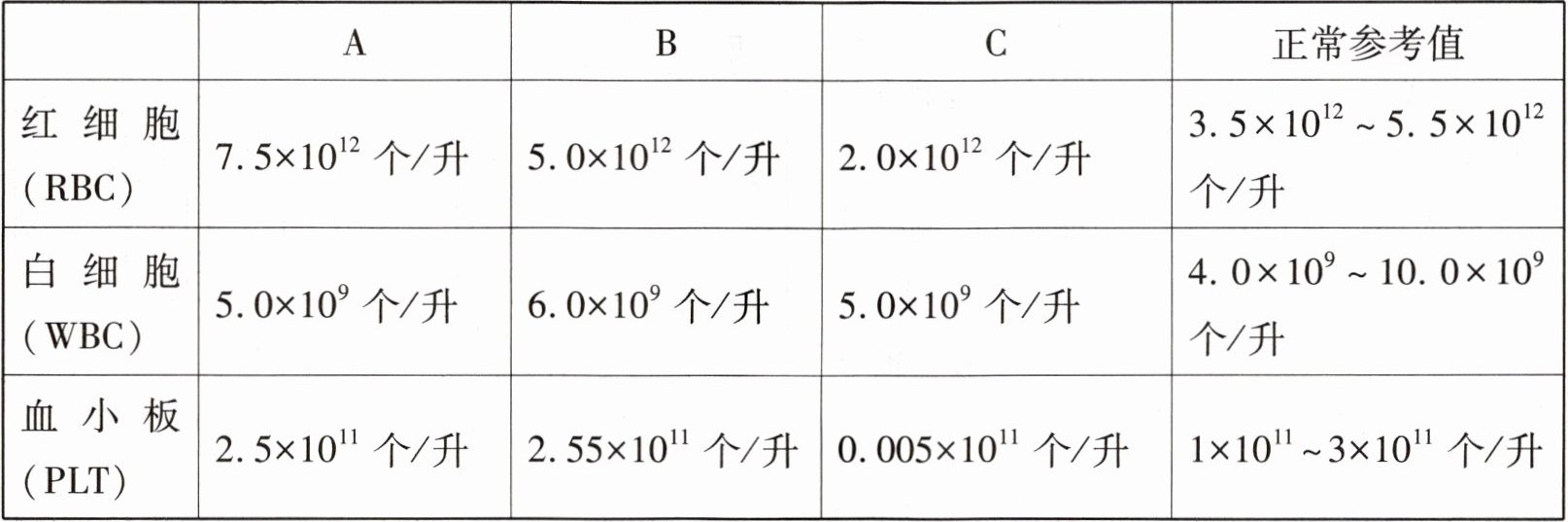 (2)A C 血小板有止血和加速凝血的功能,C的血小板数量远低于正常参考值