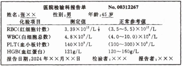|RBC(红细胞计数$) 3.39×10^1^2/L ↓ (3.5~5.5)×10^1^2/L$|