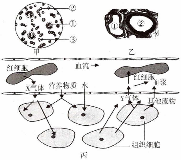 (5)图丙所示血管为_________,判断依据为_________;其中的 X 是由红细胞释放出来的气体,它是_________。