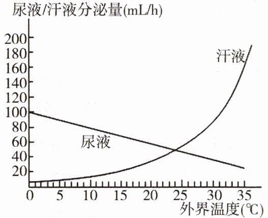 2. (2024 年·河南期中)如图是某健康人汗液和尿液分泌量随外界温度变化的曲线图。有关分析错误的是(