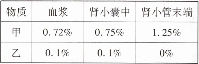 11. 表中是某健康人肾动脉中的血浆、肾小囊及肾小管末端液体内甲、乙两种物质的浓度。据此判断甲、乙分别是 (
