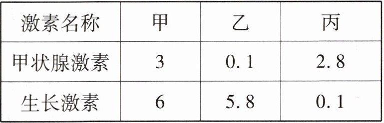 6. 用体重相近、发育正常且程度相似的甲、乙、丙三只雄性幼狗进行实验:甲不做处理,乙、丙分别切除某种内分泌腺,几个月后分别测定其血液中的激素含量,结果如下表所示(单位:$\mu g/100mL$血液)。下列分析错误的是(