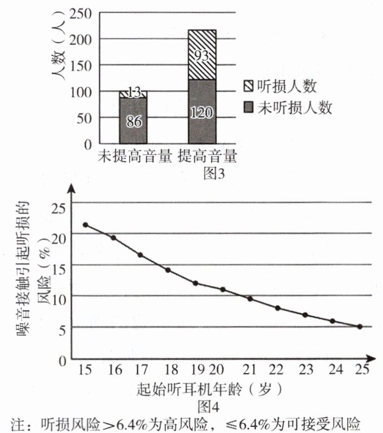 。(3)科研人员研究了不同起始听耳机年龄的人暴露在噪音下引起的听损风险情况,结果如图4。据图可知,起始听耳机年龄约为