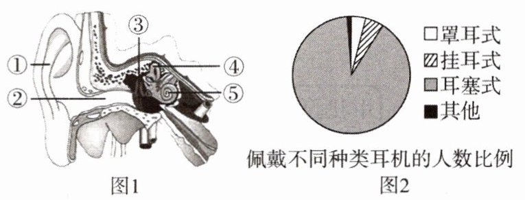 (1)佩戴耳机听音乐时,声波经外耳道传到鼓膜,鼓膜的振动通过听小骨传到内耳,刺激图1中[⑤]