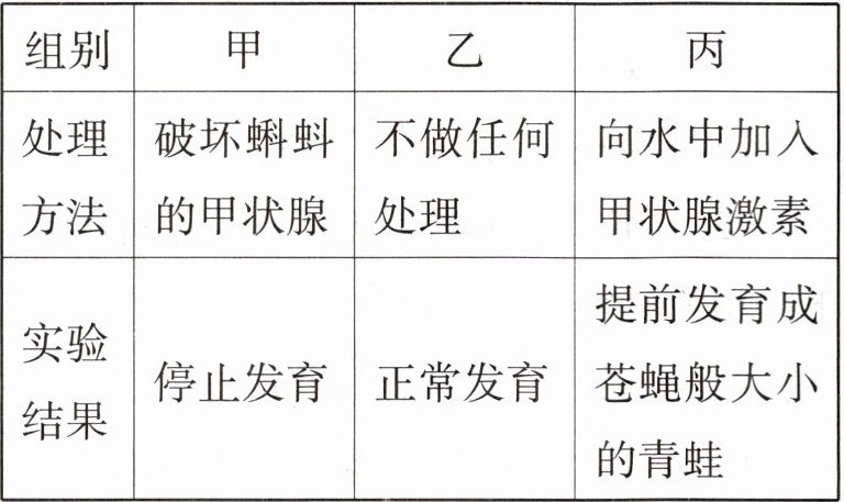 3. 某生物学兴趣小组利用蝌蚪进行甲状腺激素的探究实验,如下表是该小组的实验结果记录,下列分析错误的是(
