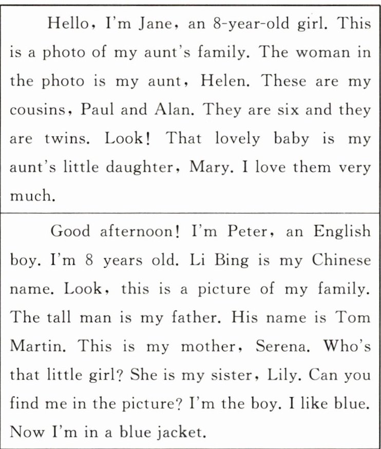 This is a photo of my family. My parents, my 3 and I are in the picture. This is my father. His name is Frank. He is a 4 in my school. My mother is Alice. She is a teacher too. 5 is the girl in a red jacket? She is my sister, Cindy. We are in the same grade, but in different classes. Look! There is an English book in her hand. She is good at English 6 my English is not good. She often helps me with my English. She is 7. In this photo, there is a 8 schoolbag. It is not mine. It's 9. Green is her favourite colour. But this morning she lost it in the park. A pencil box, a book and a map are in it. If you 10 it, please call Cindy at 021-48379273.
