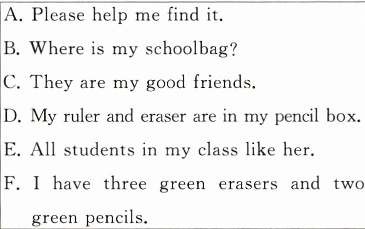 Hi, my name is David. I’m a boy. I like green. 1. _________ I am in Class Four. In my class, there are nine boys and eight girls. Li Ning and Wang Fang are my classmates. 2. _________ My English teacher is Mrs Gao. She is very nice. 3. _________ This is my desk. It is in the middle of my classroom. You can see two pens, three pencils, an English book, a key and a pencil box on it. 4. _________