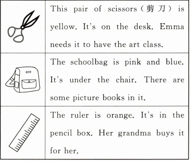 )4. What does Emma need the scissors for?[A] The art class. [B] The maths class. [C] The music class. [D] The English class.