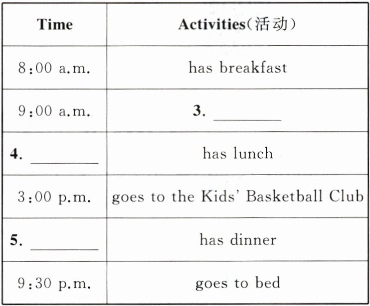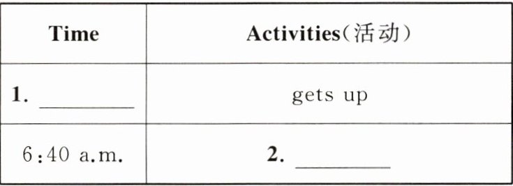 根据短文内容,完成彼得的作息时间表(时间用英语表达)。