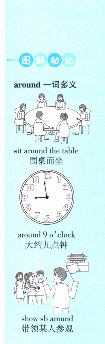 ①It is around/about five o'clock. ②让我带你到处参观一下。 ③The dog runs around the garden.