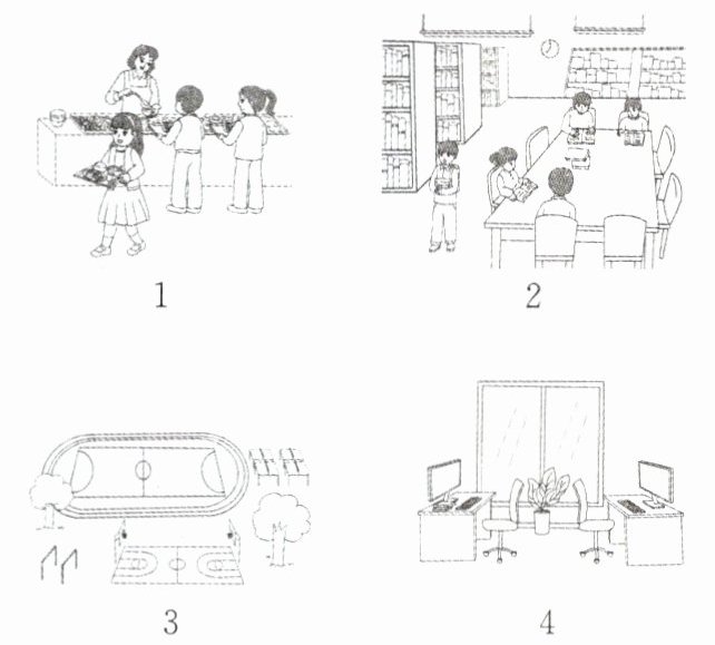 1. dining hall 2. library 3. sports field 4. office