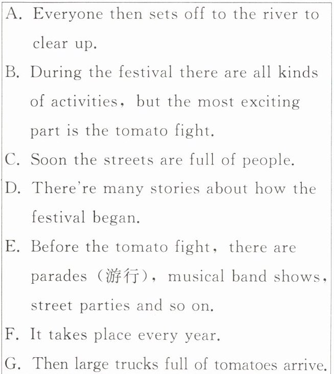 E. Before the tomato fight, there are parades (游行), musical band shows, street parties and so on.