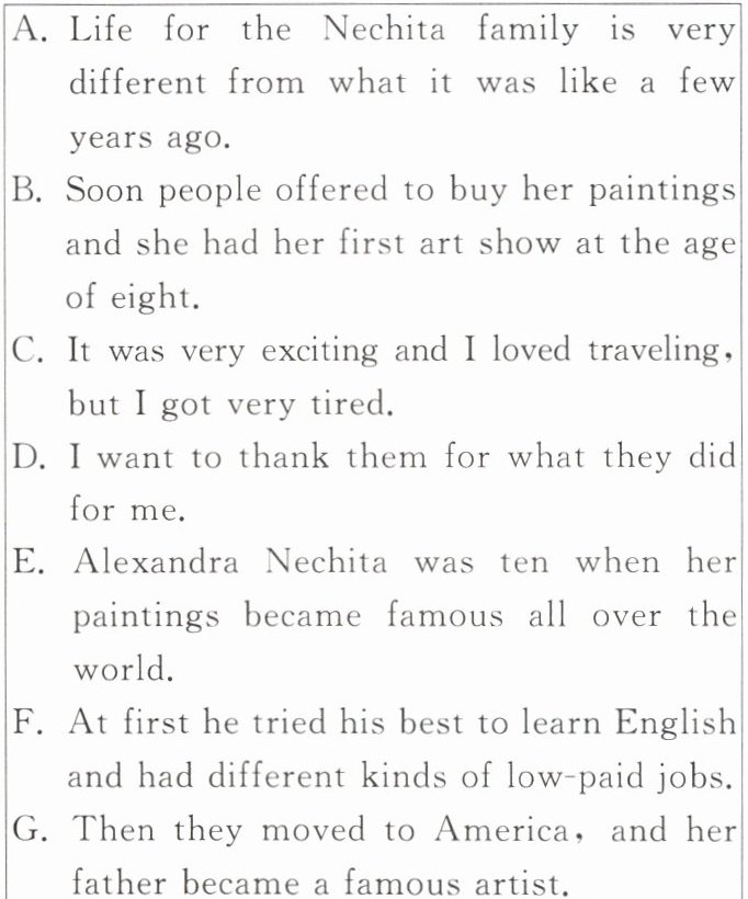 Stories about this child appeared in the newspapers and television. They now live in a large house with a swimming pool. Her mother said, “We started without anything, but thanks to Alexandra, we have everything we ever dreamed of.”A. Life for the Nechita family is very different from what it was like a few years ago.