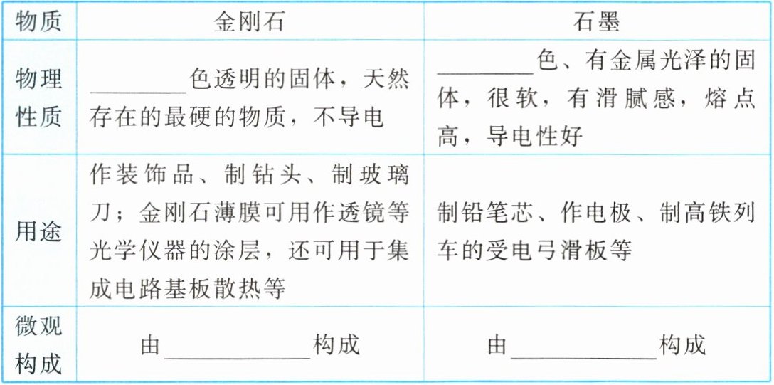 色、有金属光泽的固体,很软,有滑腻感,熔点高,导电性好||用途|作装饰品、制钻头、制玻璃刀;金刚石薄膜可用作透镜等光学仪器的涂层,还可用于集成电路基板散热等|制铅笔芯、作电极、制高铁列车的受电弓滑板等|