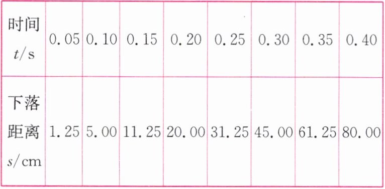 |下落距离$s/cm$|1.25|5.00|11.25|20.00|31.25|45.00|61.25|80.00|