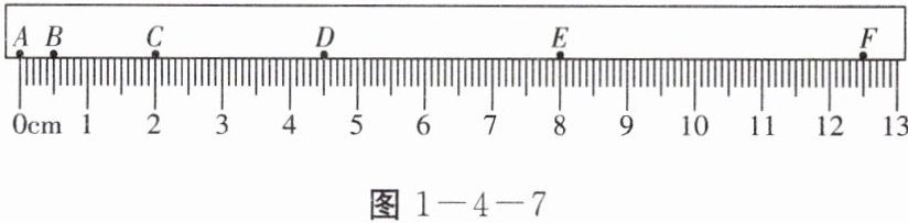6. 如图 1 - 4 - 7 所示是一小球从 A 点沿直线运动到 F 点的频闪照片,若频闪照相机每隔 0.1s 闪拍一次,分析照片可知:小球从 D 点到 F 点共运动了