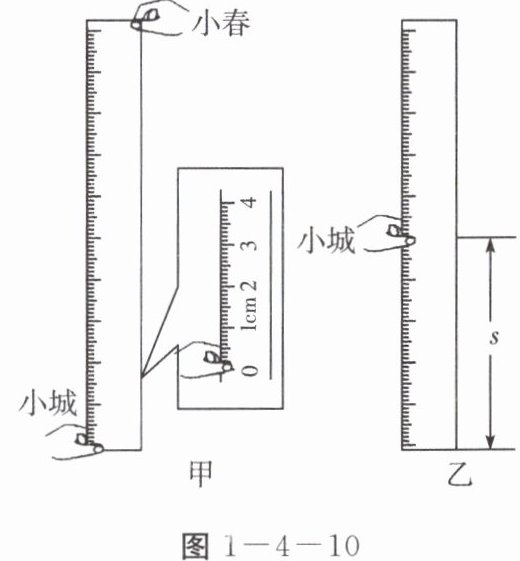 小城的拇指、食指张开,钢尺在两指中间,且两指上沿与钢尺零刻度线齐平(如图 1 - 4 - 10 甲所示)。小城看到小春由静止释放钢尺时,马上用手抓钢尺。手抓住钢尺时如图 1 - 4 - 10 乙所示。钢尺下落$s$的时间,即小城的反应时间。若实验中测量$s = 40.00cm$,小城的反应时间可能是