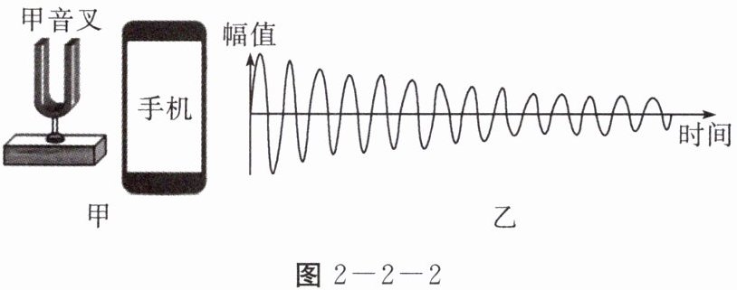 7. 如图2-2-2甲所示,将甲音叉振动时发出的声音输入手机中的噪声检测软件和示波器,某一瞬间手机软件显示音叉发出的声音的响度为40dB,同时在示波器上观察到如图2-2-2乙所示的波形;若将乙音叉放在甲音叉原来的位置使其振动发声,手机(位置不变)软件显示音叉发出的声音的响度为60dB。下列理解正确的是(