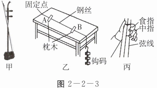 。(5)二胡演奏时可通过手指按压、松开、滑动等指法配合产生优美旋律,图2-2-3丙中小吉手握上端,两手指按压的是音符“3”“4”位置,已知相同条件下,弦越短,音调越高,为发出音符“3”(“3”比“4”音调低),此时他最简单合理的操作是松开