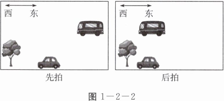 4. 面包车和小轿车均自东向西做匀速直线运动,如图 1 - 2 - 2 所示是小林站在同一位置连拍的两张照片,则以面包车为参照物(