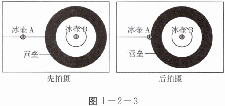 8. 如图 1 - 2 - 3 所示,冰壶比赛中,照相机对着大本营附近同一位置先后拍摄了两张照片,两次拍摄的过程中(