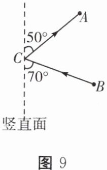 9.(宜昌)航天员舱外作业时,宽厚的航天服限制了他的视野,为了看清胸前的操作面板,可以通过手腕处的小镜子进行观察。图 9 中$A$点代表航天员的眼睛,$B$点代表胸前某一按钮,$C$点是小镜子的位置,请你根据反射光路图在$C$点准确画出镜面,并标出镜面与竖直面的夹角。(保留作图痕迹)