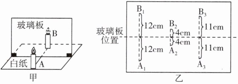 。(2)改进器材后多次改变蜡烛 A 的位置,并移动另一支蜡烛,确定每次像的位置,将玻璃板及每次物和像的位置记录在玻璃板下面的白纸上,连接物和对应的像点,如图 10 乙所示,由此可得出的结论:像与物到平面镜的距离