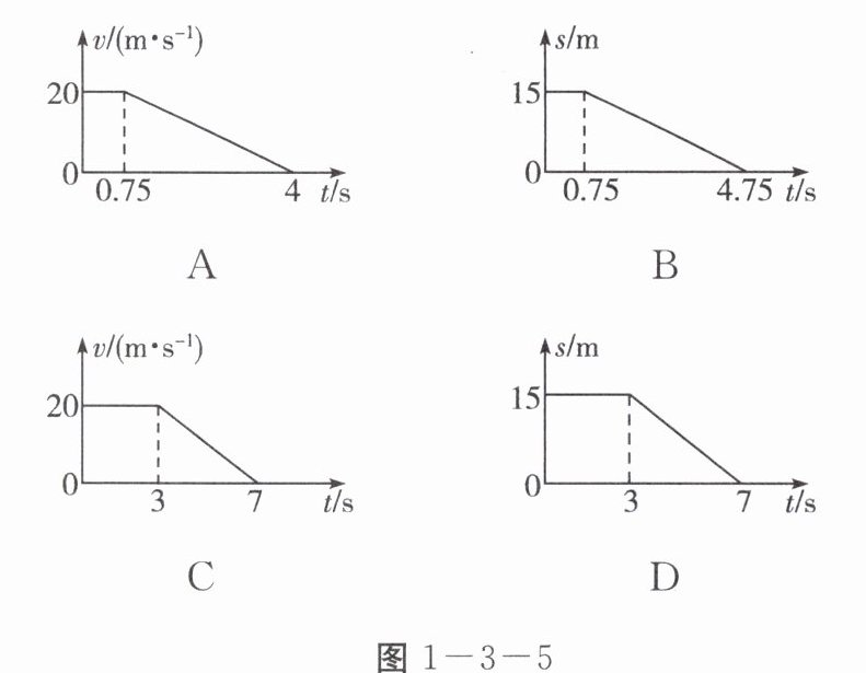6. 汽车在公路上以 $ 20m/s $ 的速度匀速直线前行,司机发现前方出现障碍物,经 $ 0.75s $ 的反应时间后开始刹车,刹车后滑行 $ 4s $ 才停下(如图 $ 1 - 3 - 4 $ )。研究表明司机酒后驾驶的反应时间是平时的 $ 4 $ 倍。下列能描述司机酒后驾驶的汽车运动图像为图 $ 1 - 3 - 5 $ 中的 (